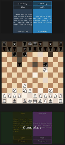 - Ajedrez + Cartas: Juega un ajedrez clásico en un tablero 12 x 12, pero prepárate para efectos que rompen las reglas. Convierte piezas enemigas, intercambia posiciones o neutraliza el tablero.